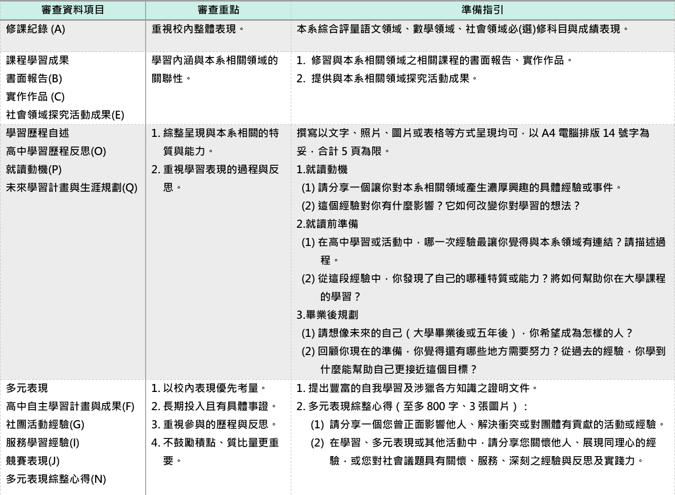 修課紀錄(A)、課程學習成果(B. C. E.)、學習歷程自述(O. P. Q.)、高中自主學習計畫與成果(F)、社團活動經驗(G)、服務學習經驗(I)、競賽表現(J)、多元表現綜整心得(N) -
